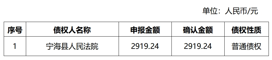 若各位债权人对下表中管理人审定的本人或他人债权有异议,须在收到书面通知或管理人公示债权审查结果后10日内以书面方式向管理人提出异议,详细阐述异议的事实和理由,并提供相应证据(原已经通知、公示或提过异议的不得再重复提出)。债权人如对管理人的异议复核结果仍有异议,须在收到书面复核结果后15日内向宁海县人民法院提起债权确认之诉。逾期未提出异议或未起诉的,视为认可债权审查结果。