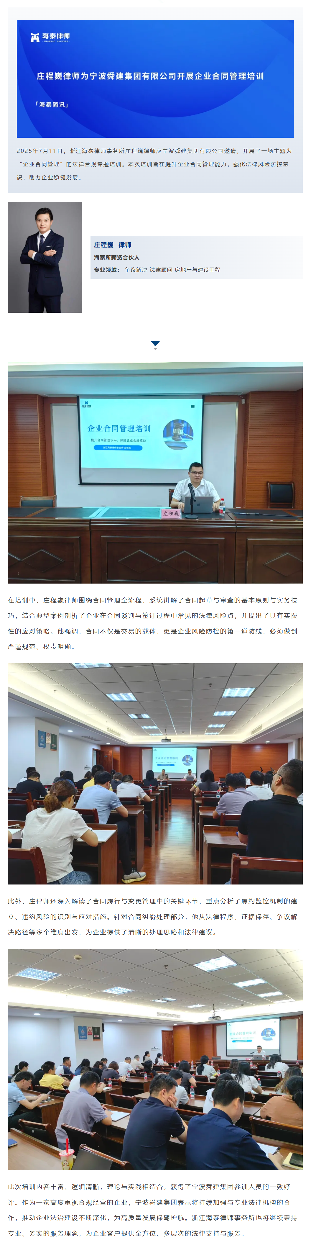 庄程巍律师为宁波舜建集团有限公司开展企业合同管理培训 | 海泰简讯
