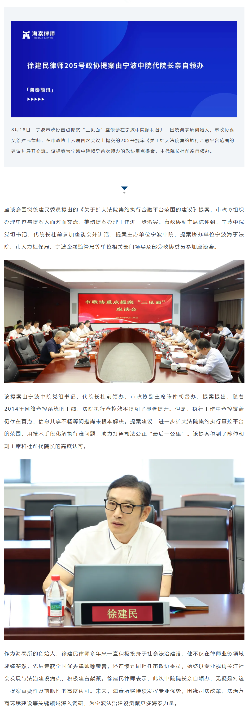 徐建民律师205号政协提案由宁波中院代院长亲自领办 | 海泰简讯