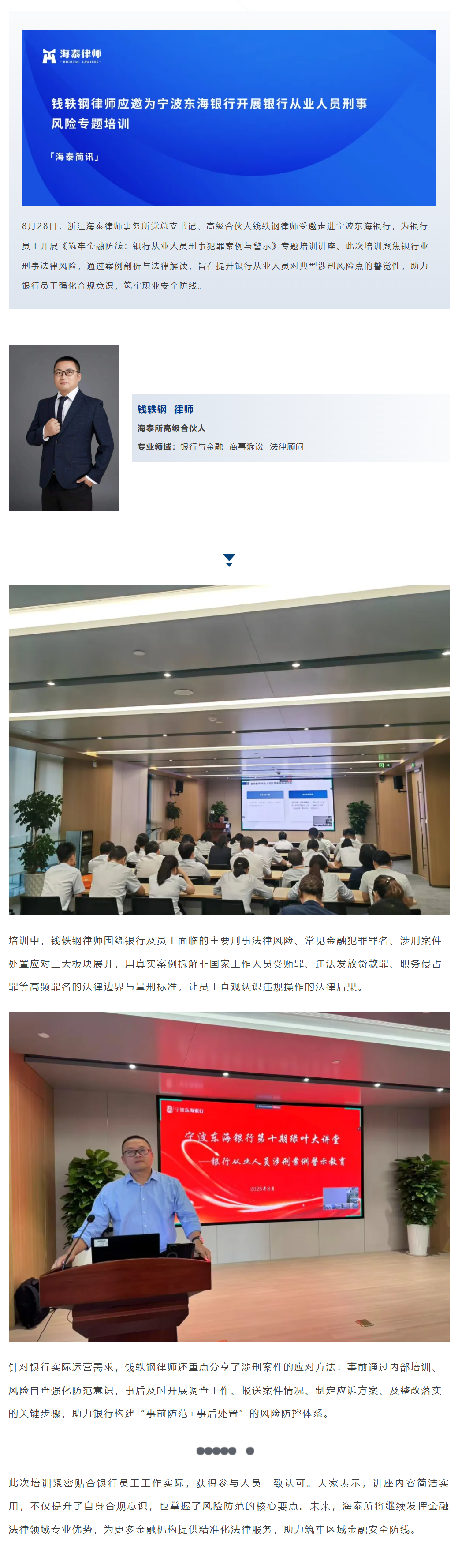 钱轶钢律师应邀为宁波东海银行开展银行从业人员刑事风险专题培训 | 海泰简讯