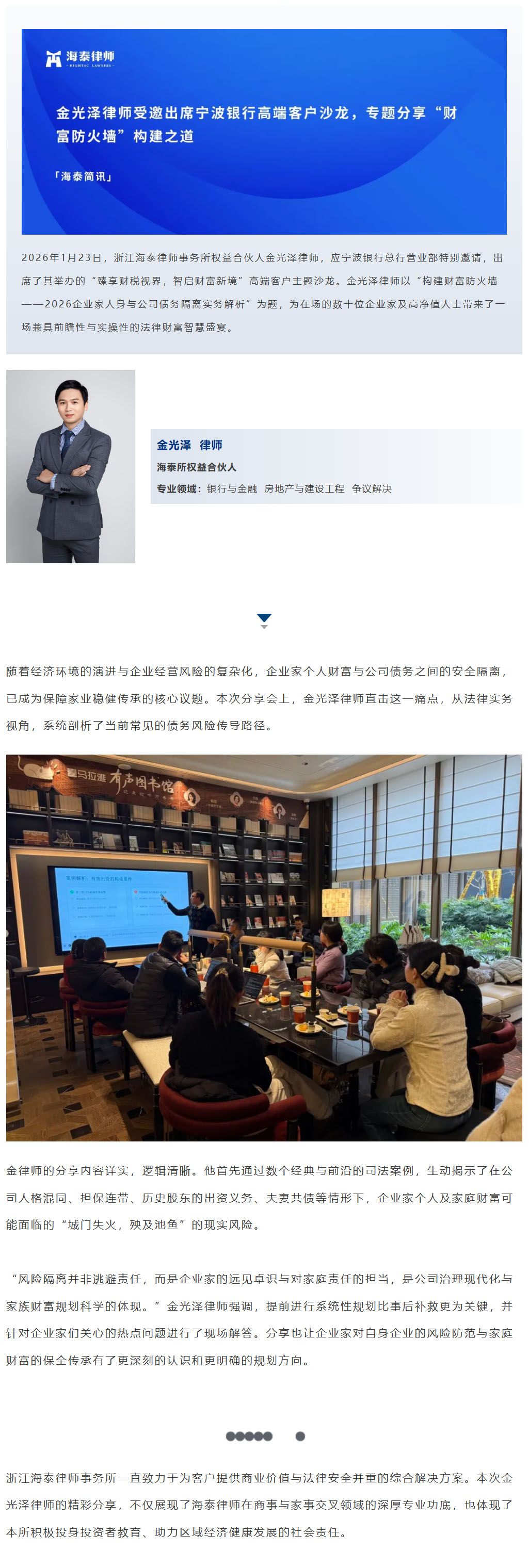 金光泽律师受邀出席宁波银行高端客户沙龙,专题分享“财富防火墙”构建之道 | 海泰简讯