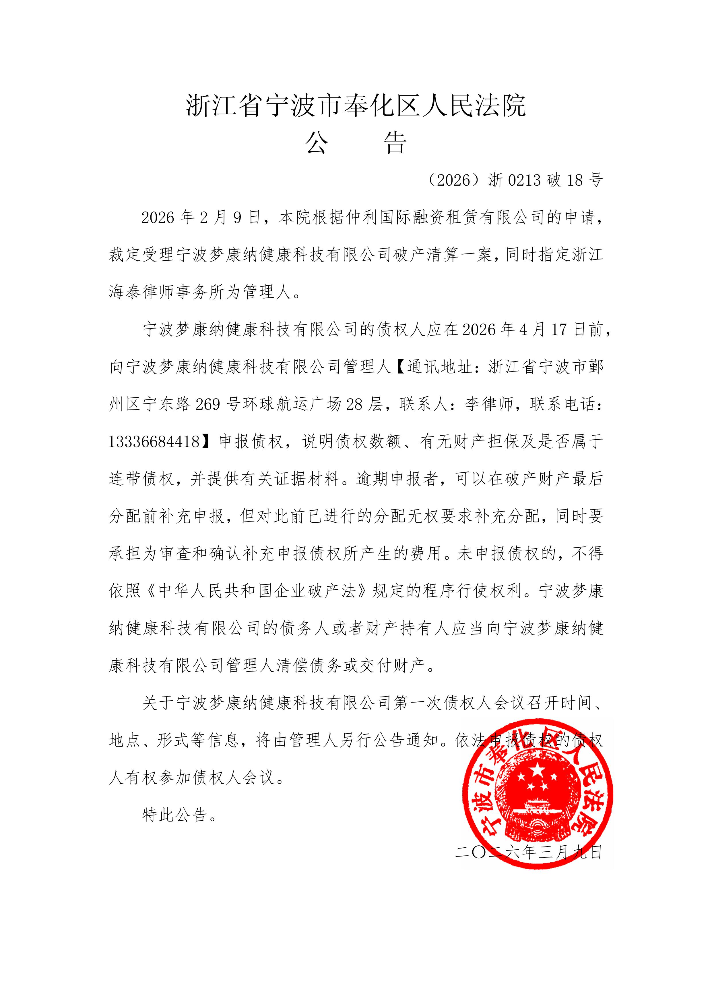 宁波梦康纳健康科技有限公司破产公告