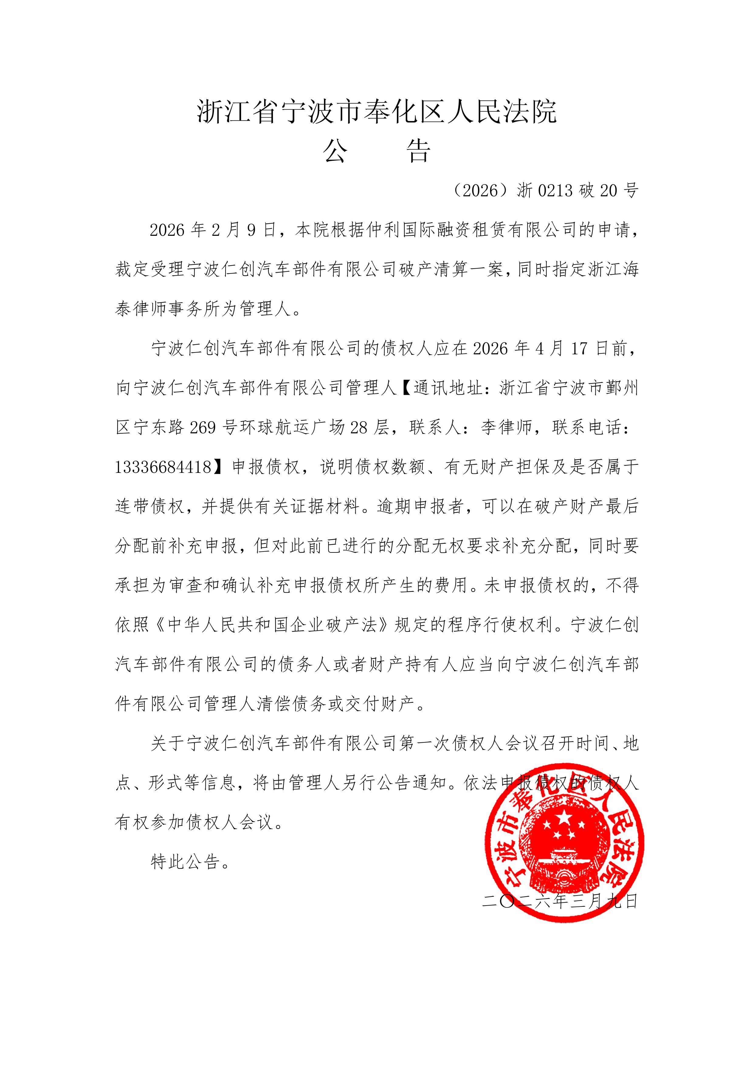 宁波仁创汽车部件有限公司破产公告