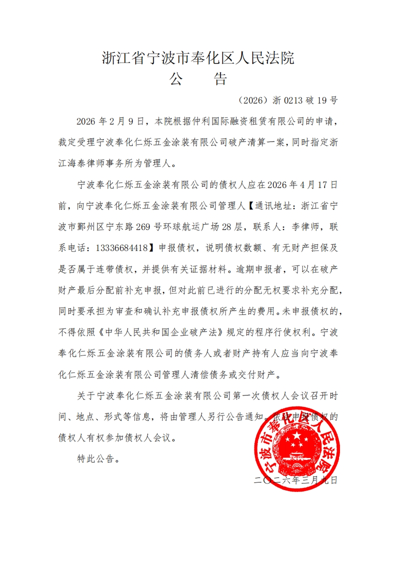 宁波奉化仁烁五金涂装有限公司破产清算案 债权申报材料