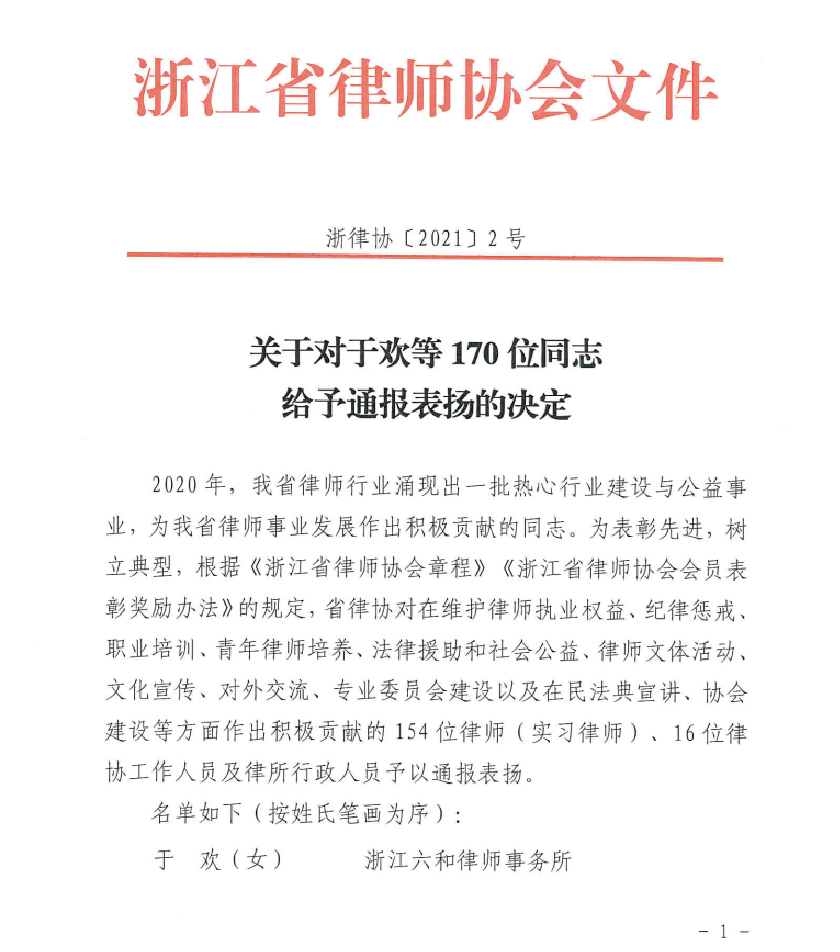 为表彰先进,树立典型,浙江省律师协会对在维护律师执业权益、纪律惩戒、职业培训、青年律师培养、法律援助和社会公益、律师文体活动、文化宣传、对外交流、专业委员会建设以及在民法典宣讲、协会建设等方面作出积极贡献的154位律师(实习律师)、16位律协工作人员及律所行政人员予以通报表扬。我所支援嵊泗海岛的法律援助律师王子文、陈熙、高旷、王红女,以及省律协知识产权专业委主任吕甲木律师为省律师事业发展作出积极贡献,位列其中。