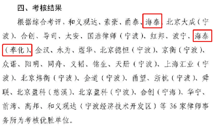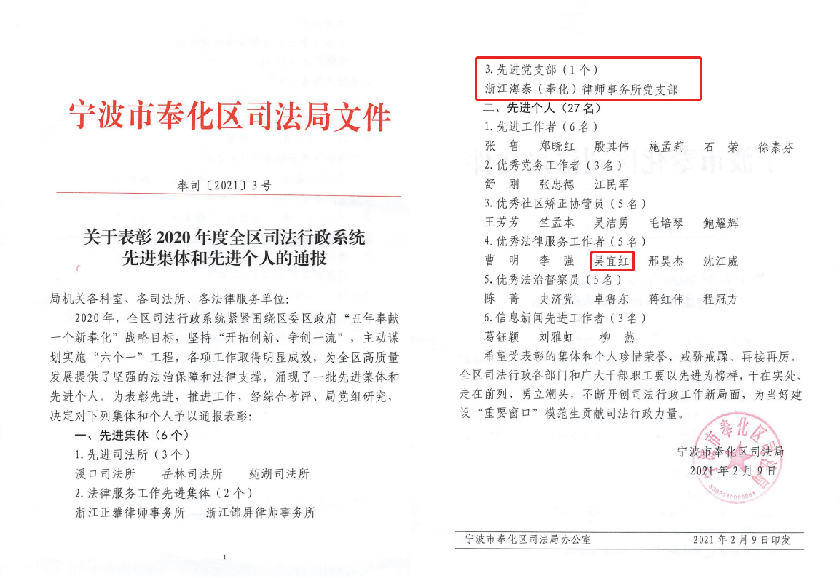2020年,浙江海泰(奉化)律师事务所党支部荣膺奉化区司法行政系统“先进党支部”。