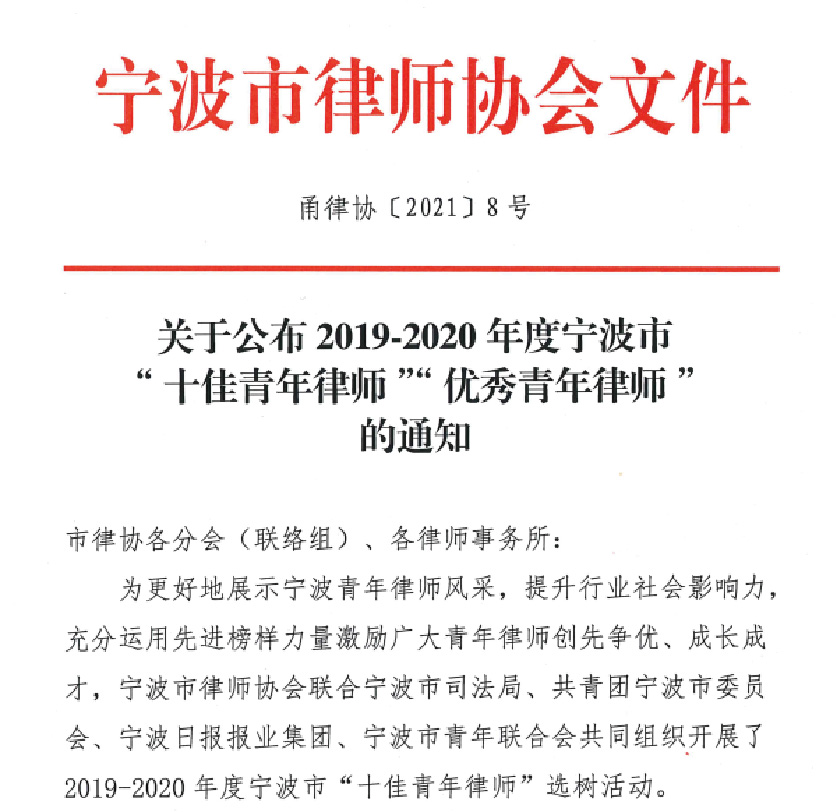 政治强、业务精、作风好、服务优,我所王仲志律师荣获2019-2020年度宁波市“十佳青年律师”称号,乐柯南律师荣获2019-2020年度宁波市“优秀青年律师”称号。