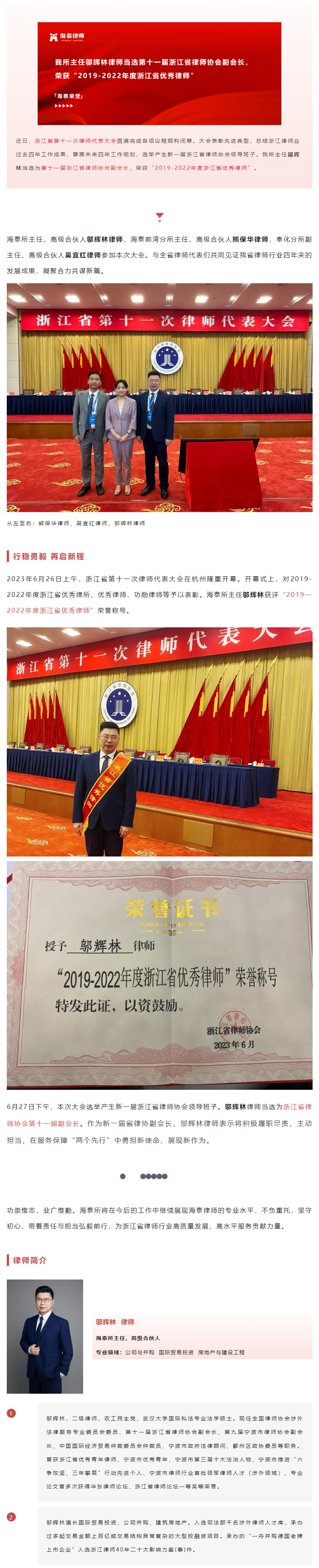 我所主任邬辉林律师当选第十一届浙江省律师协会副会长,荣获“2019-2022年度浙江省优秀律师”