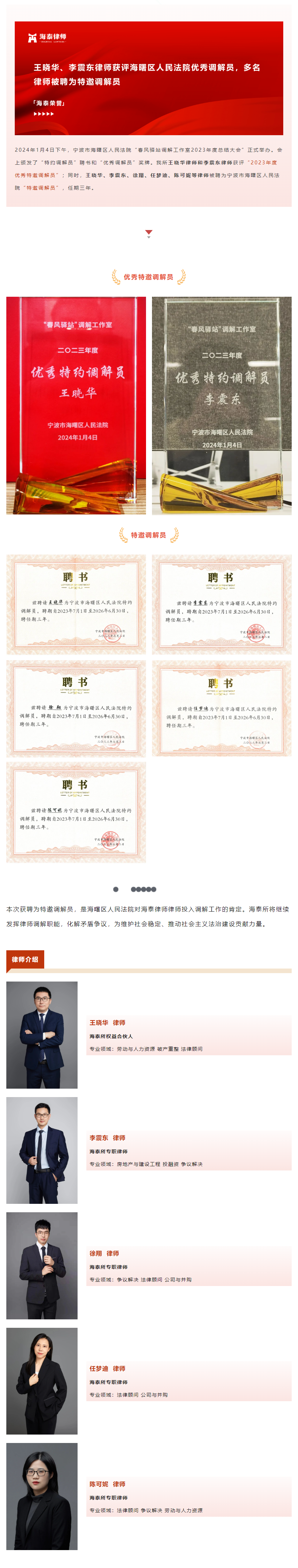王晓华、李震东律师获评海曙区人民法院优秀调解员,多名律师被聘为特邀调解员