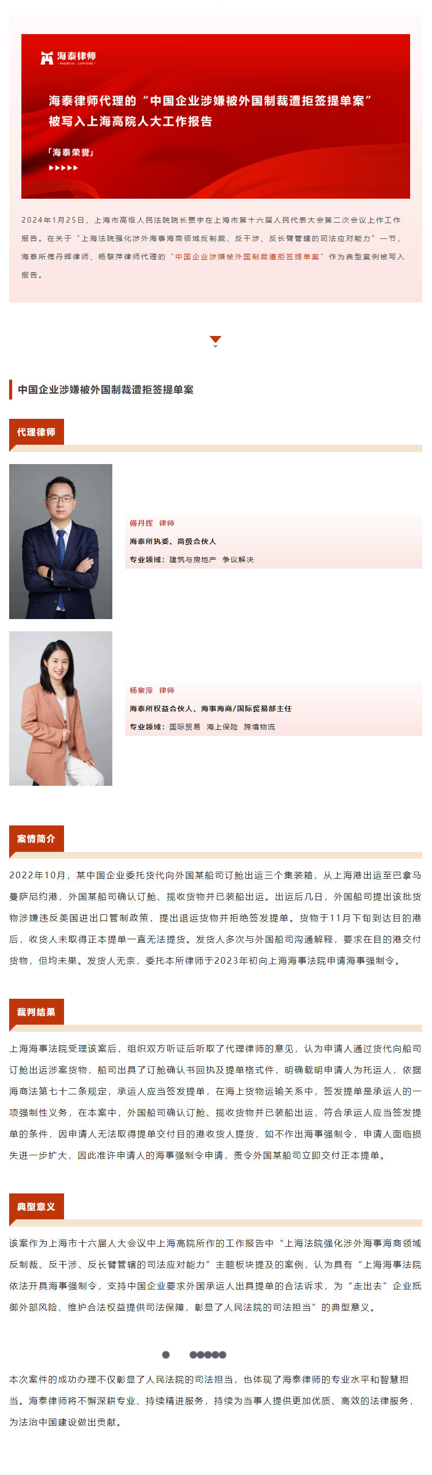 海泰律师代理的“中国企业涉嫌被外国制裁遭拒签提单案”被写入上海高院人大工作报告