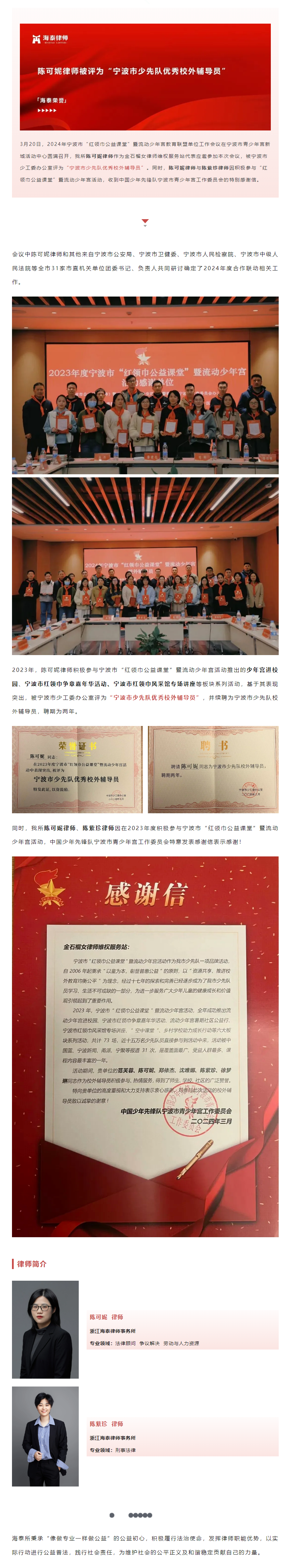 陈可妮律师被评为“宁波市少先队优秀校外辅导员”