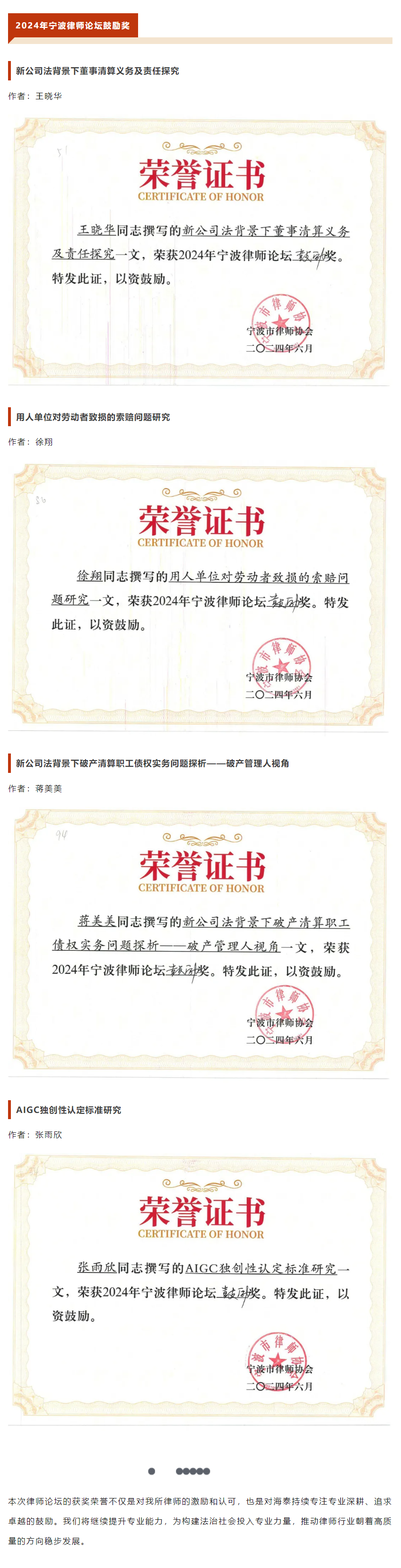 海泰律师荣获2024宁波市律师论坛论文一、二、三等奖