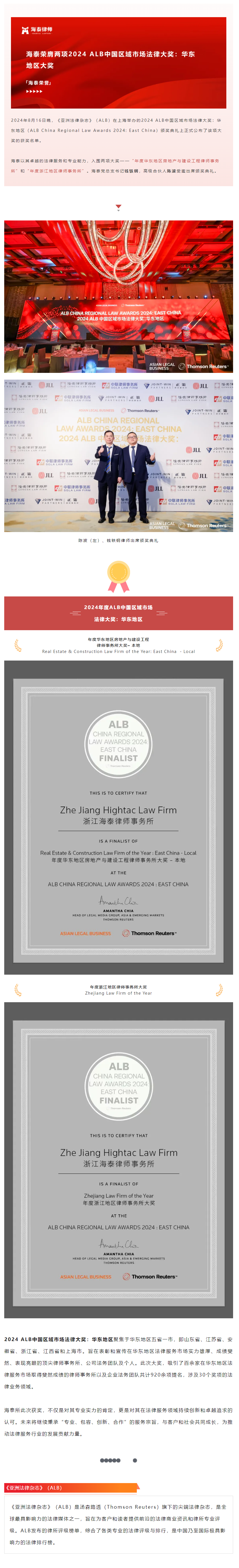 海泰荣膺两项2024 ALB中国区域市场法律大奖:华东地区大奖