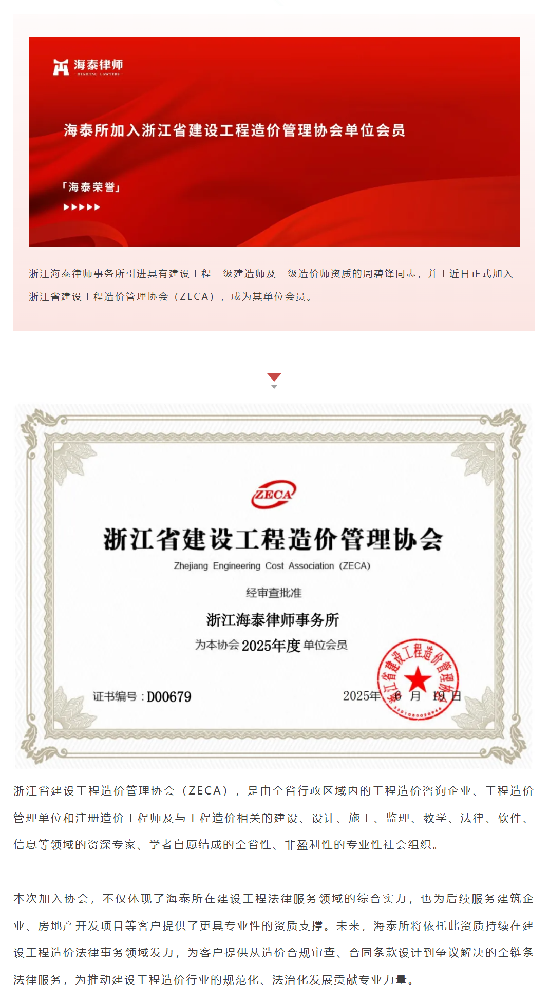 海泰所加入浙江省建设工程造价管理协会单位会员