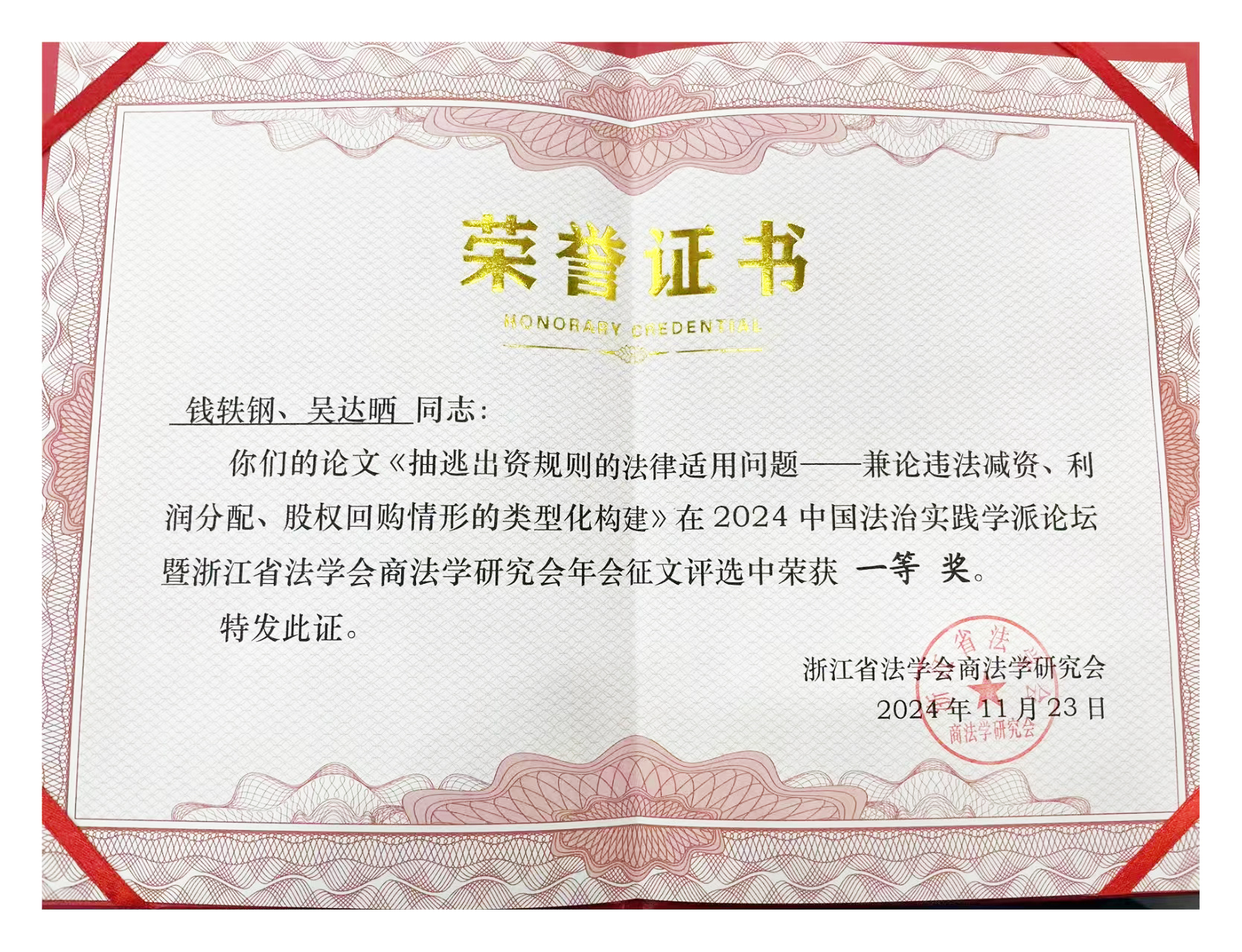 钱轶钢、吴达晒律师在浙江省法学会商法学研究会年会征文评选中荣获一等奖