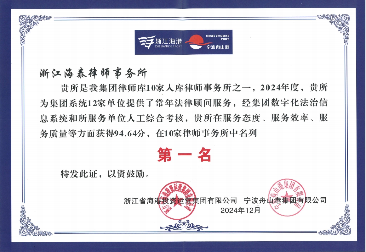海泰所荣获浙江省海港集团常年法律顾问律师库服务综合考核第一名