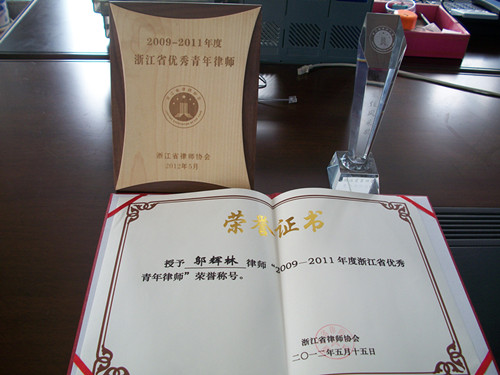 2011年18-20日,第四届浙江省青年律师论坛在温州市洞桥金元开元度假村隆重举办。邬辉林律师作为获奖代表,接受省律协授予的“浙江省优秀青年律师”奖项荣誉。同时,邬辉林律师凭借五分钟时间的幽默、风趣的即兴演讲和风采展示,获得了“最佳风采奖”。