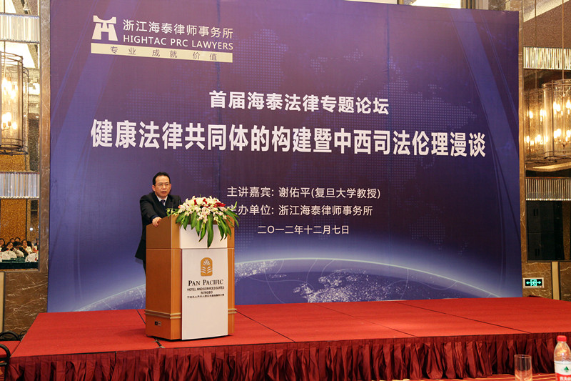 2012年12月7日下午14时,浙江海泰律师事务所在宁波市民安东路泛太平洋大酒店三楼会议厅举办“首届海泰法律专题论坛”,隆重邀请著名法学家、博士生导师、复旦大学“司法与诉讼制度研究中心主任”谢佑平教授作主题讲座,谢教授讲座的主题是“法律共同体的健康构建暨中西方司法伦理漫谈”。
