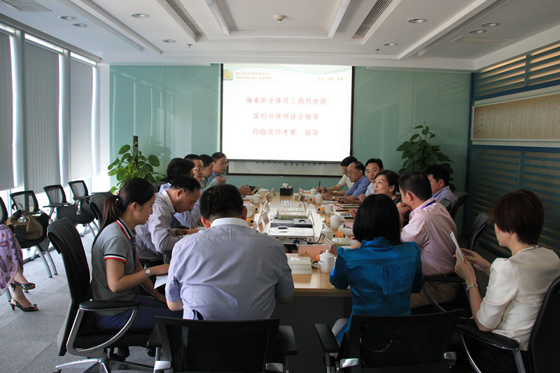 张勇会长一行参观了我所新办公楼并了解了我所的基本情况。座谈会上,陈波主任热情致辞欢迎“来自南国的同行兄弟”。针对深圳律协代表团此行“律师事务所管理发展模式”的调研主题,陈波主任重点介绍了我所四个方面的创新机制:即制订《海泰总纲》,创新民主、科学管理;实行绩效考核,创新财务分配制度;实行专业分工,团队合作,打造本土化精品所;使用OA管理系统,使海泰信息化迈上新台阶。接下来通过图文并茂PPT讲解的方式,向远方的客人更加全面地展现了我所的基本情况、组织架构、办所理念、服务模式、发展特点与优势、工作亮点等内容。
