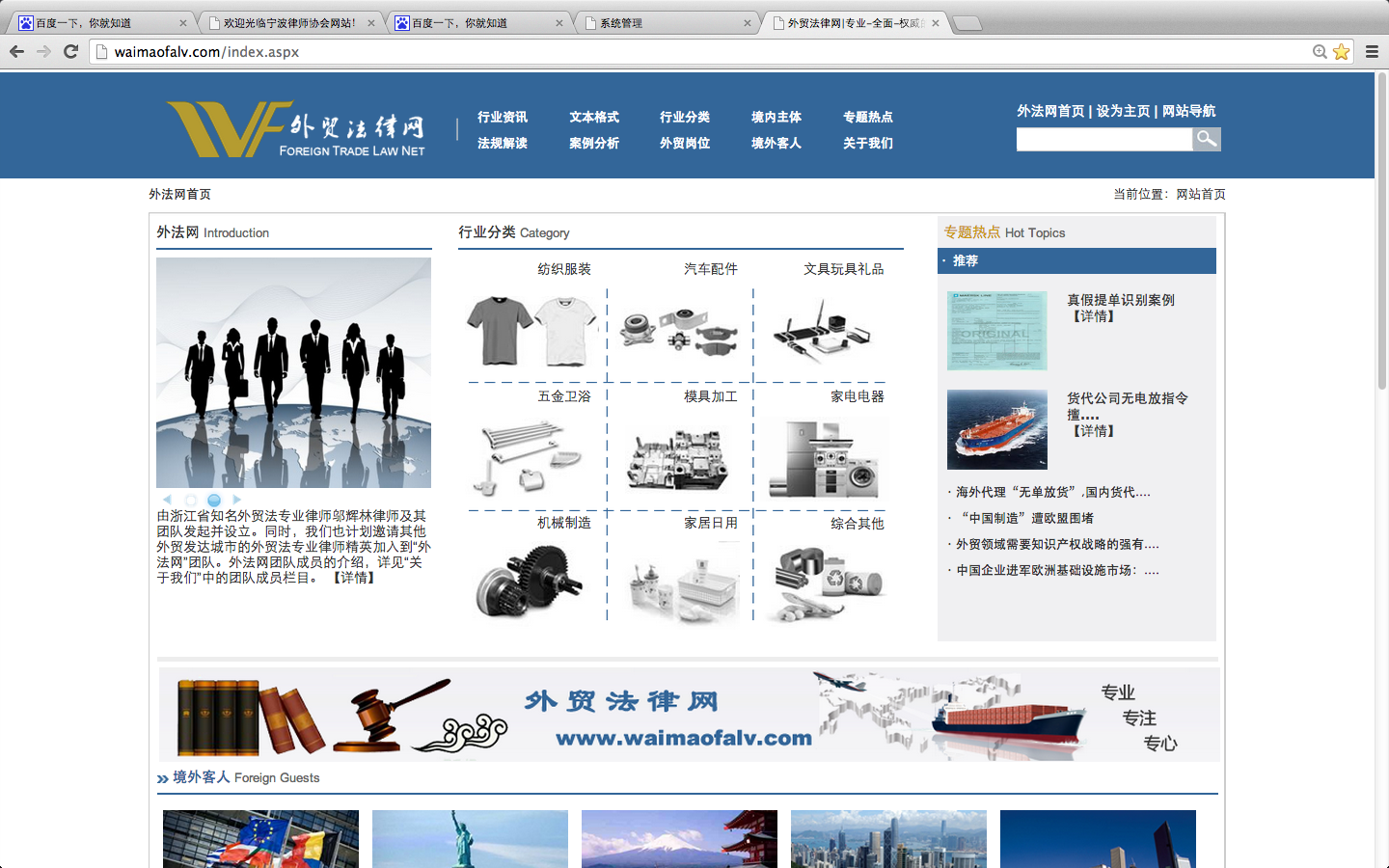 外贸法律网是根据对宁波市外贸不同行业、企业的法律服务需求的调研结果而专门设立的法律咨询平台。该网站首次提 出“大外贸法”概念,对律师而言是一个专业化研究、知识储备的平台,对企业客户而言是一个公益性的法律咨询平台。