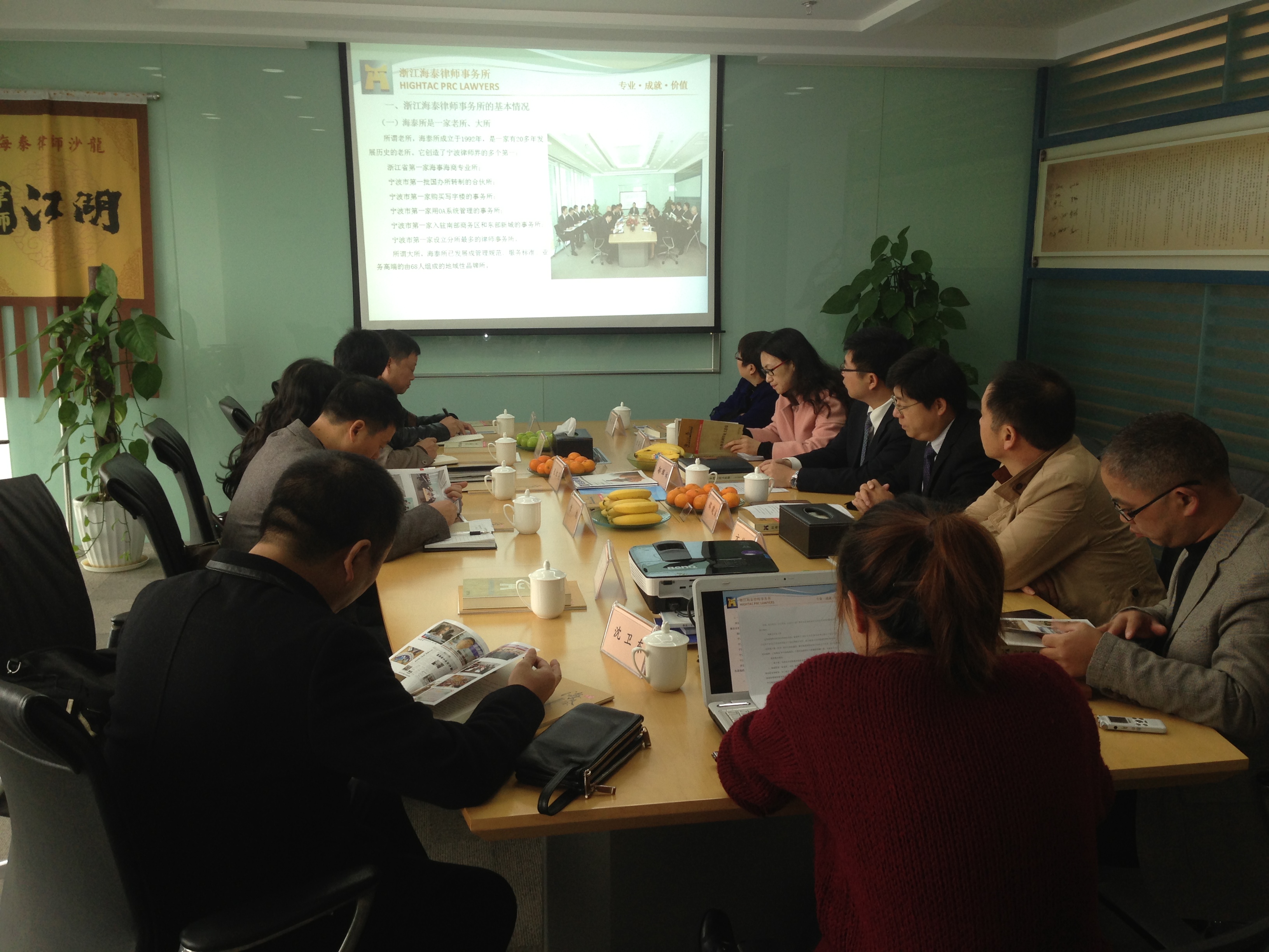 在合伙人邵建波、邬辉林律师陪同下,考察人员参观了本所的办公环境。在本所会议室由楼维儿律师结合PPT简要介绍了海泰所的基本情况、组织架构、办所理念、发展目标、服务模式、创新改革及工作亮点。随后。双方就共同关心的律师事务所的管理体制、分配制度等内容进行了广泛的交流与探讨。