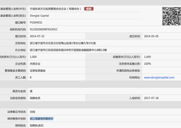 2017年7月19日,浙江海泰律师事务所承办的宁波东来方元投资管理合伙企业(有限合伙)入会核查法律意见书通过基金业协会审核。接受东来方元私募基金管理人登记(入会核查)法律意见书项目委托后,事务所指派七星团队邬辉林、陈石律师立即投入尽调工作,快速进入工作状态,收集、审核管理人资料、开展第三方核查并实地走访企业,对高管人员进行访谈,快速通过企业情况梳理,并辅导企业严格按照《证券投资基金法》《私募投资基金监督管理暂行办法》《私募投资基金管理人登记和基金备案办法(试行)》《关于进一步规范私募基金管理人登记若干事项的公告》等相关法律法规及协会自律规则规定完成整改,顺利通过入会核查。