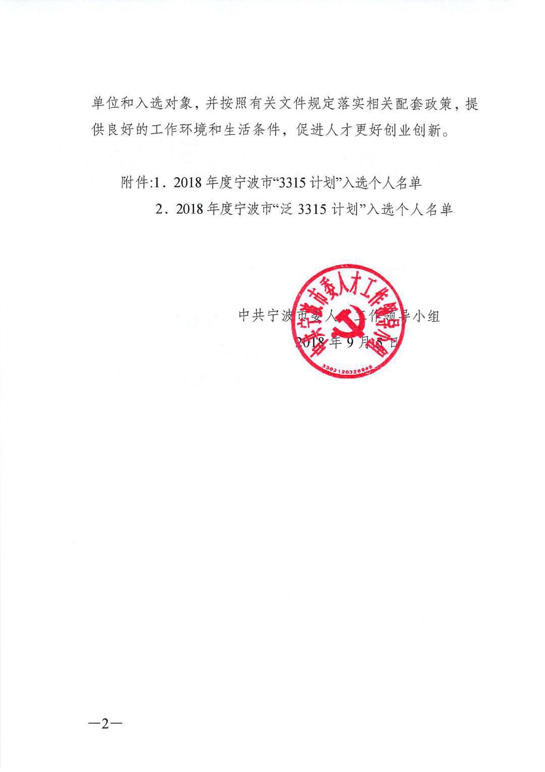 近期,中共宁波市委人才工作领导小组公布了《关于印发2018年度宁波市“3315计划”及“泛3315计划”入选个人名单的通知》(甬人才发〔2018〕3号),其中有25人入选2018年度宁波市海外高层次人才引进“3315计划”,40人入选2018年度宁波市城市经济社会发展领域高端急需人才引进“泛3315计划”。