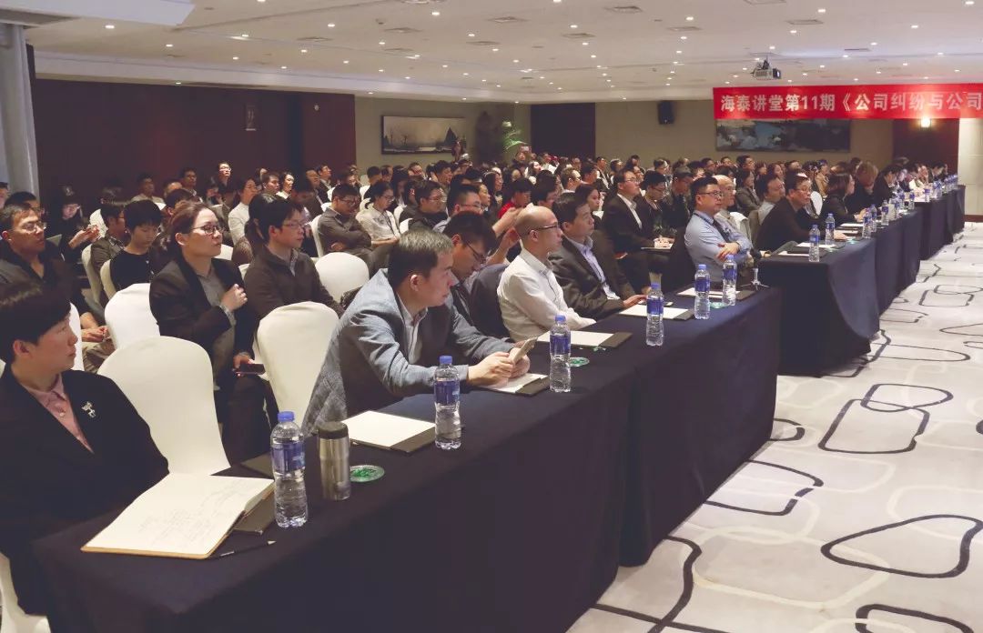 本期讲座,由宁波大学法学院教授、博士生导师、著名公司法专家、海泰所执业律师郑曙光讲授《公司纠纷与公司诉讼》。这次讲座有来自所内80+名律师,所外110+名同行律师、公务员、银行高管、上市公司高管、企业界股东、高管及法务人员等社会各界人士。海泰所合伙人、执委会执委吕甲木律师主持了本次讲座。