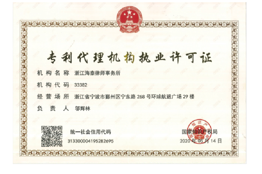 2020年5月,海泰所喜获国家知识产权局核发的《专利代理机构执业许可证》,成为宁波市第二家同时具有律师执业和专利代理资质的律师事务所,具备代理全部知识产权申请、诉讼、非诉讼业务的资质。