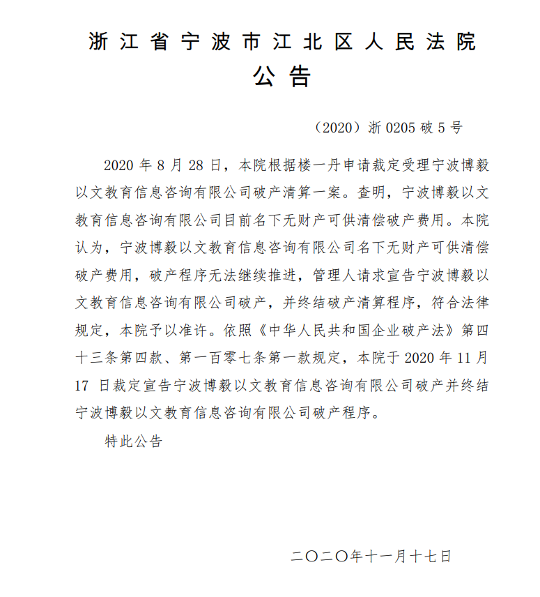 2020年11月17日,因宁波博毅以文教育信息咨询有限公司的财产不足以清偿破产费用,宁波市江北区人民法院根据宁波博毅以文教育信息咨询有限公司管理人的申请,依据《中华人民共和国企业破产法》第四十三条第四款、第一百零七条第一款规定,裁定终结宁波博毅以文教育信息咨询有限公司破产程序。
