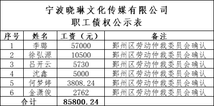 经管理人调查,截至2021年12月23日,宁波晓琳文化传媒有限公司尚欠6名职工的工资总额为人民币85800.24元(详见职工债权公示表)。现根据《中华人民共和国企业破产法》第四十八条的规定,予以公示,职工可到浙江海泰律师事务所网站(www.hightac.com)破产管理人公告信息栏目查阅。公示日期截止2022年3月31日。