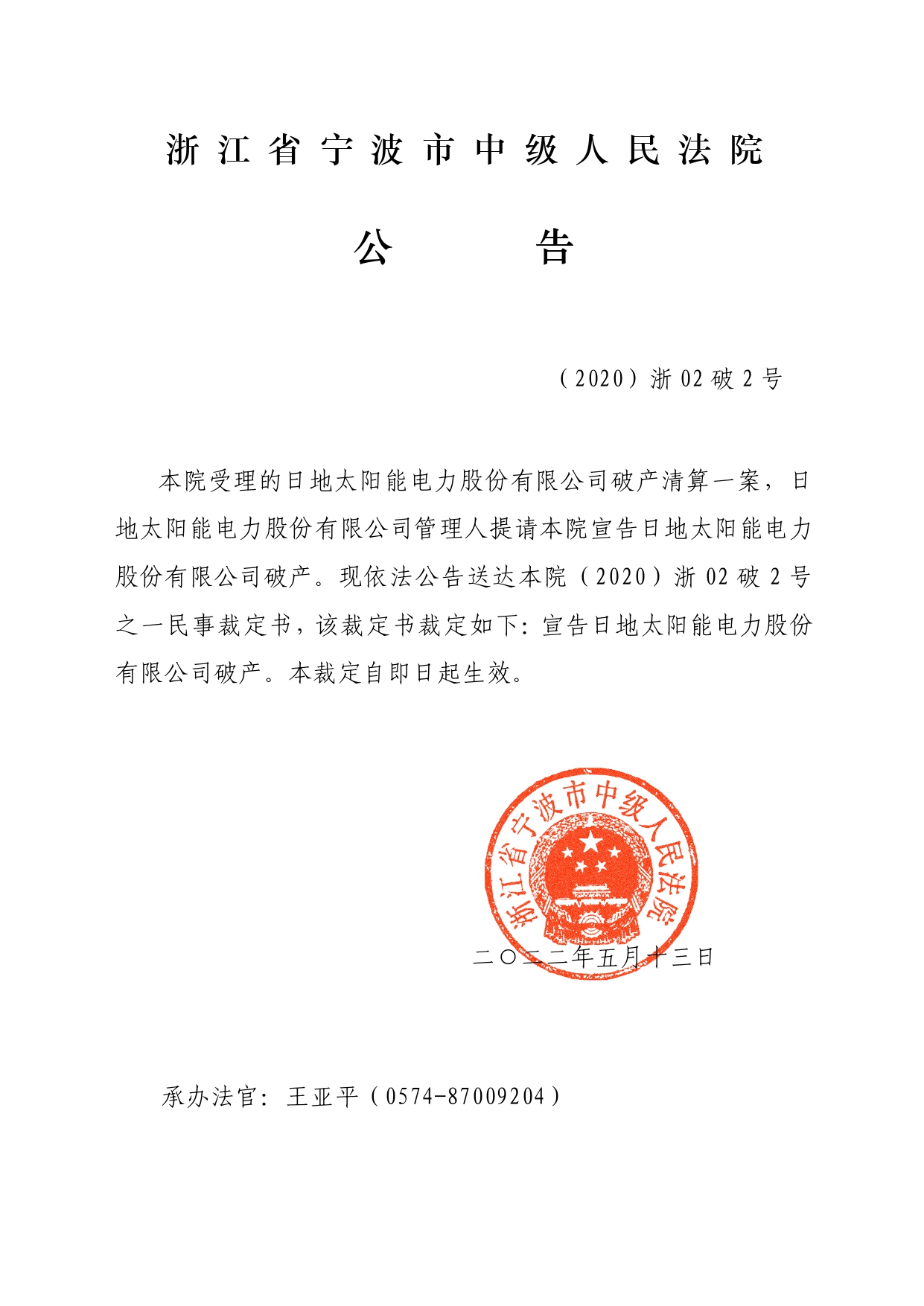 日地太阳能电力股份有限公司宣告破产公告