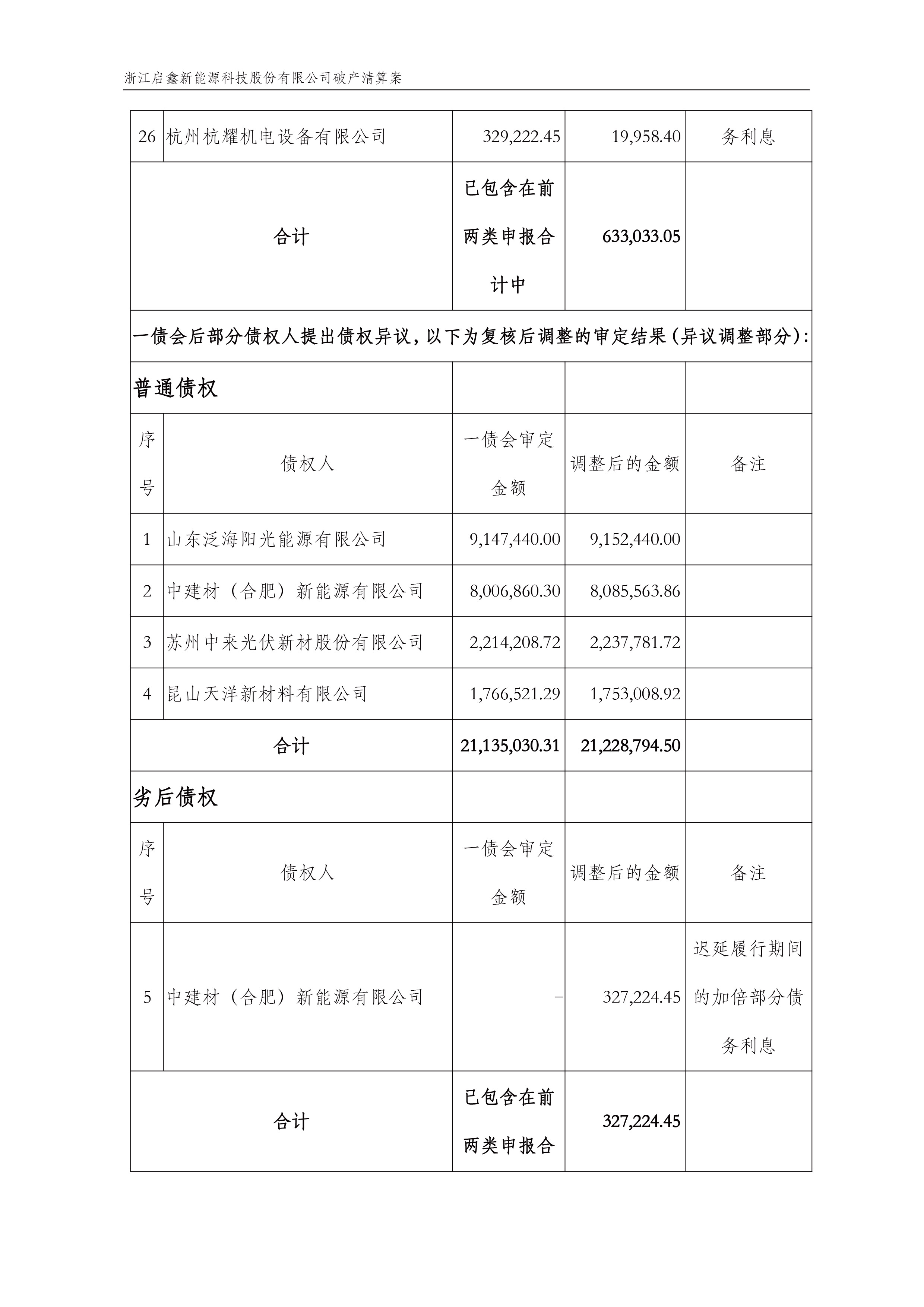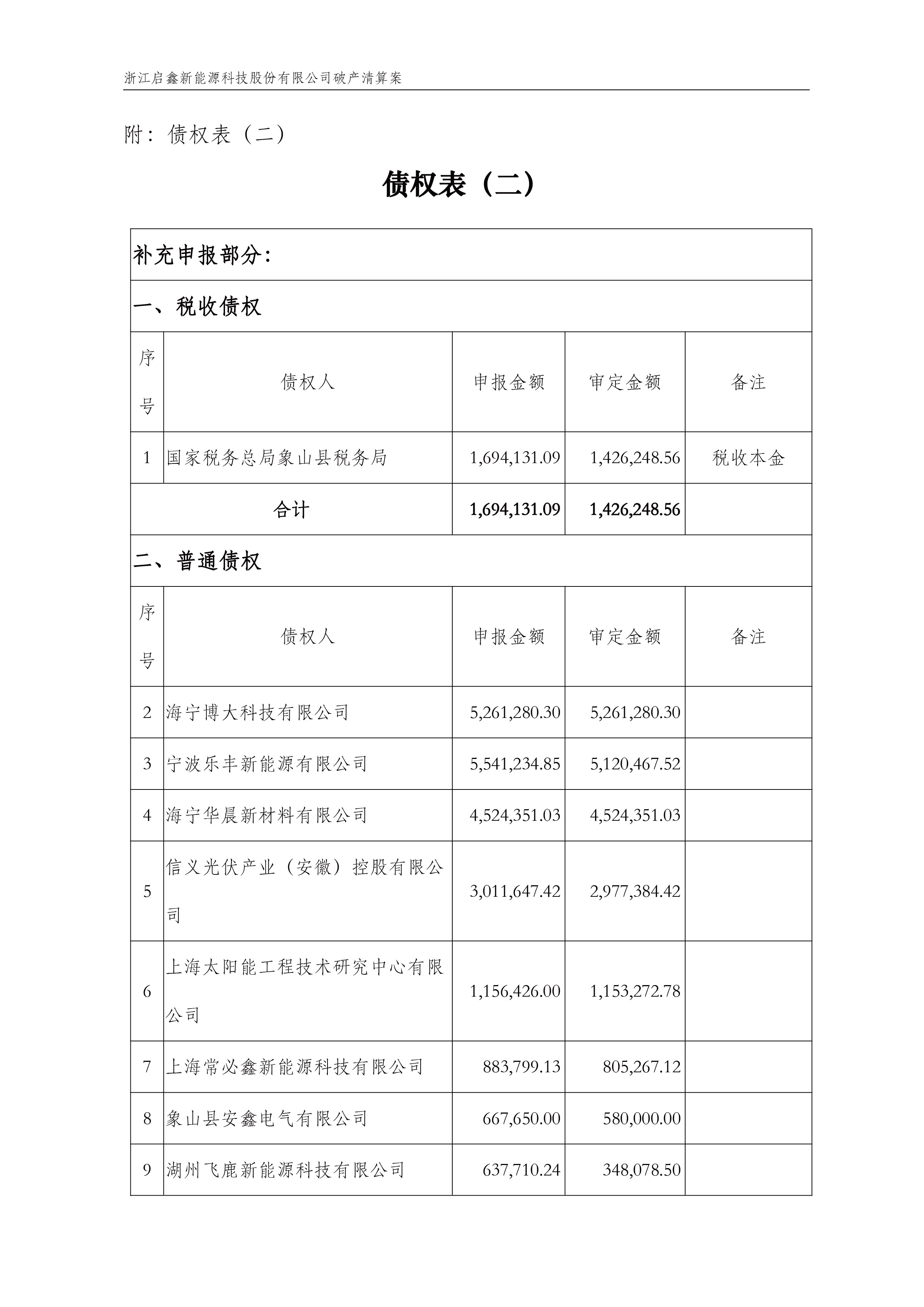 2022年1月21日,浙江启鑫新能源科技股份有限公司破产清算案已召开第一次债权人会议,浙江启鑫新能源科技股份有限公司管理人已编制债权表并记载在会议资料中,供全体债权人核查。会后,管理人陆续收到一些补充债权申报和债权异议。经审核,管理人将补充申报的债权审核结果、债权异议后存在调整的债权编制成债权表(二),现予以公示,供全体债权人核查。