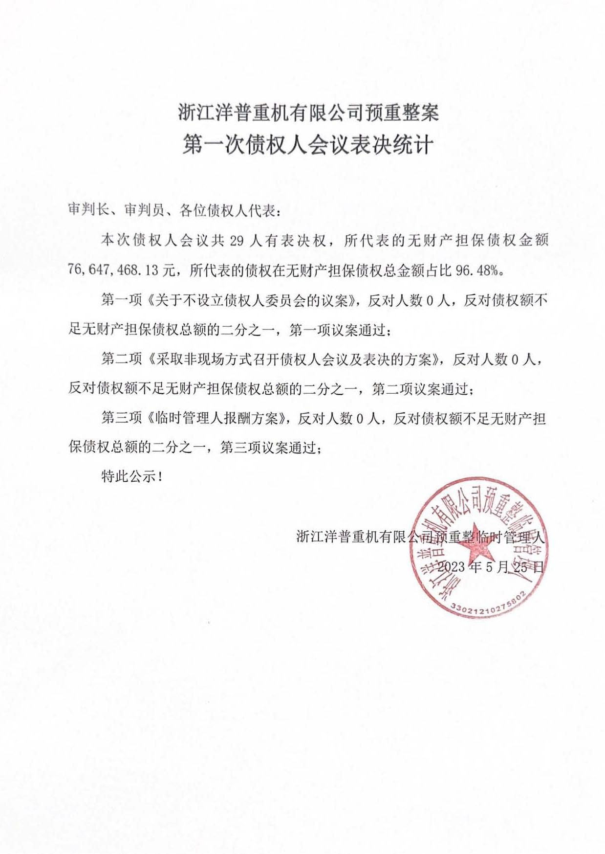 浙江洋普重机有限公司预重整案 第一次债权人会议表决统计