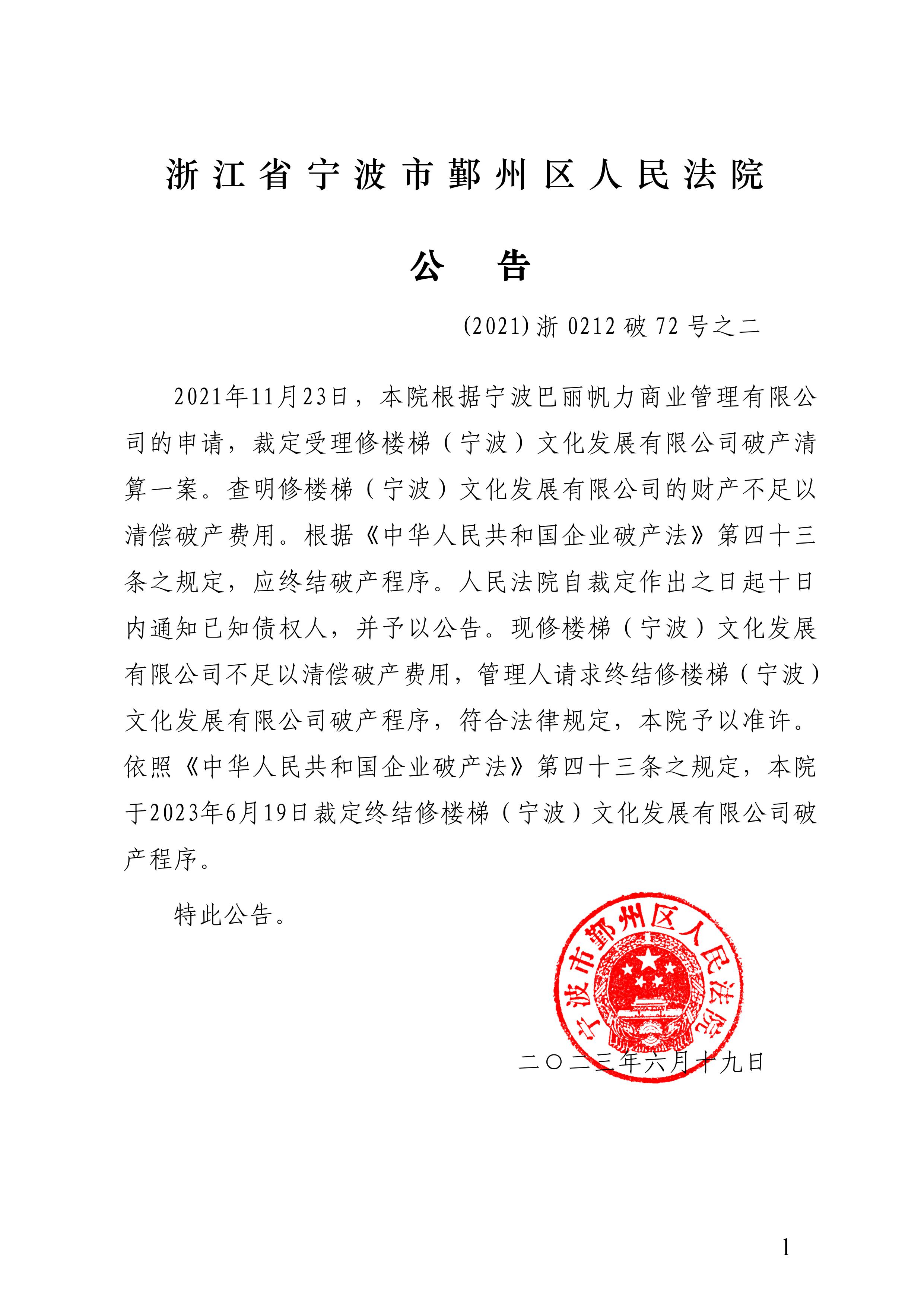修楼梯(宁波)文化发展有限公司终结破产程序公告
