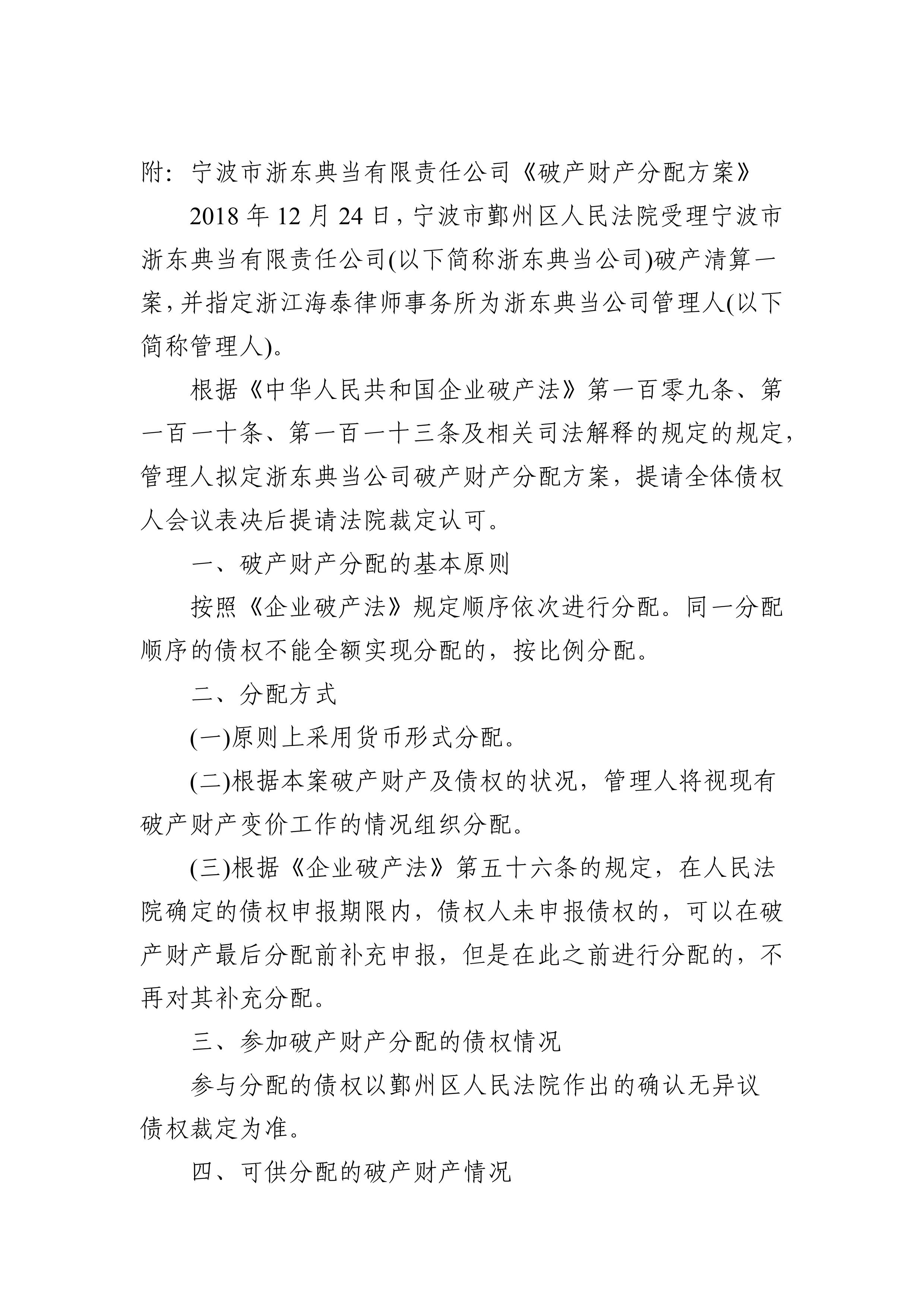 宁波市浙东典当有限责任公司《破产财产分配方案》公告