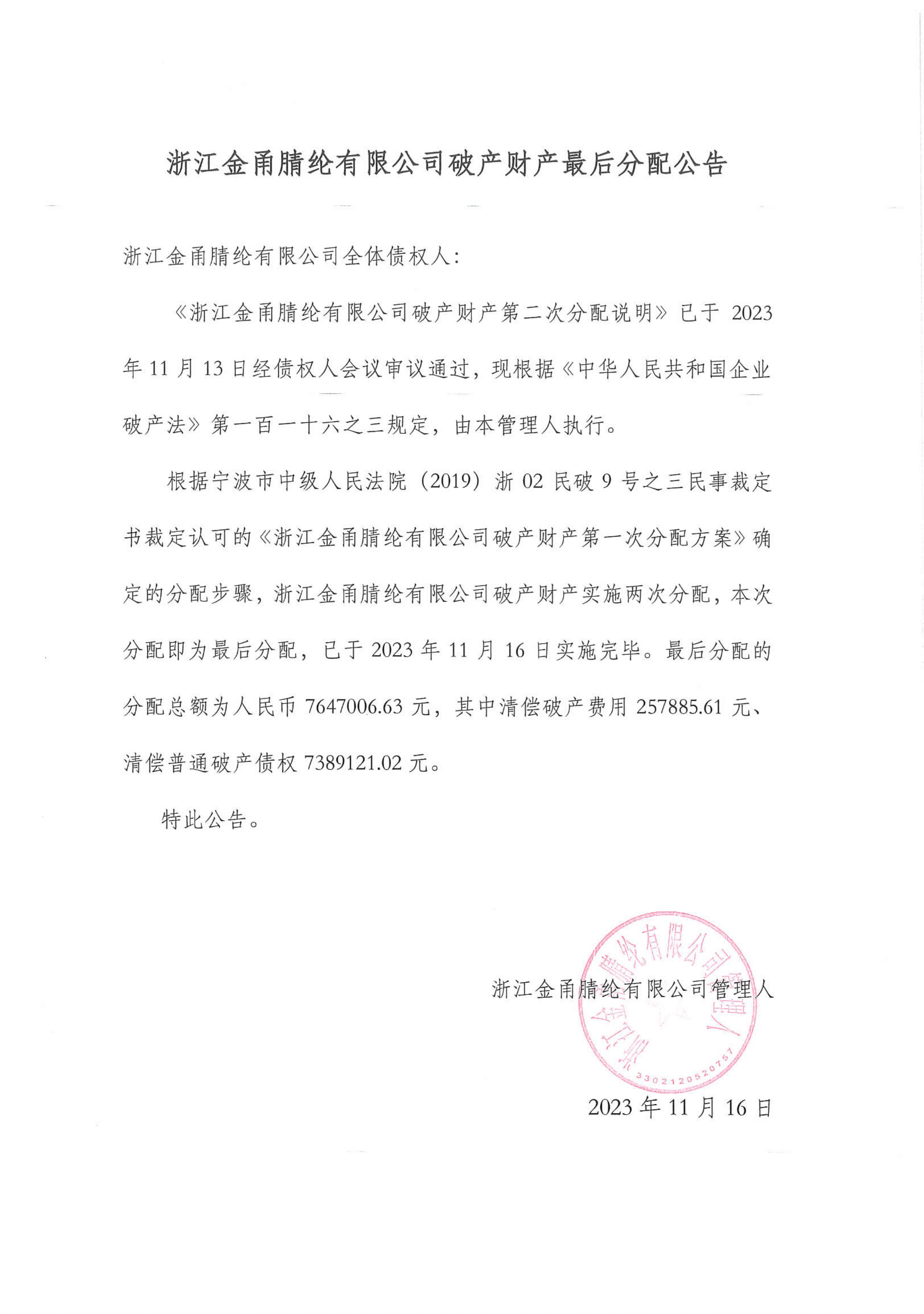 浙江金甬腈纶有限公司破产财产最后分配公告