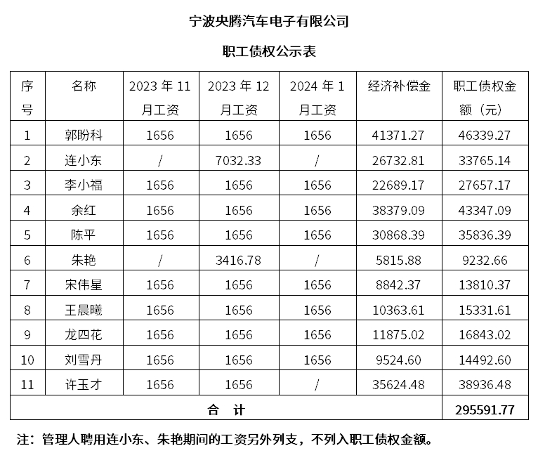 经管理人调查,宁波央腾汽车电子有限公司尚欠职工的工资、经济补偿金等费用,总金额为人民币【295591.77】元(详见职工债权公示表)。现根据《中华人民共和国企业破产法》第四十八条的规定,予以公示。公示日期截止【2024】年【5】月【6】日。