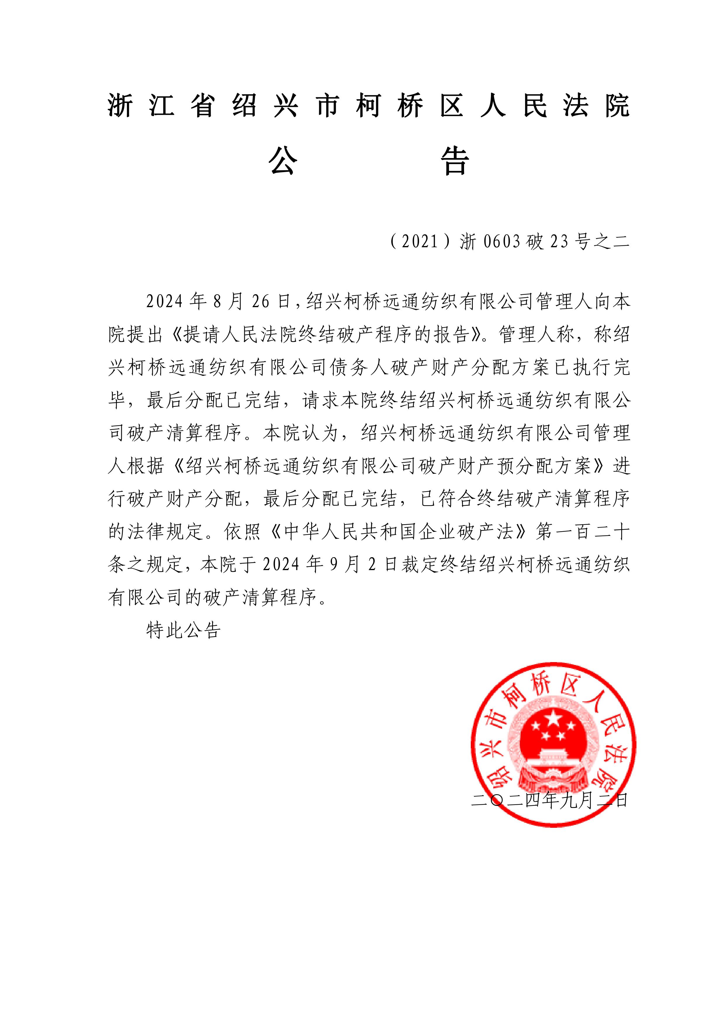 绍兴柯桥远通纺织有限公司终结破产程序公告