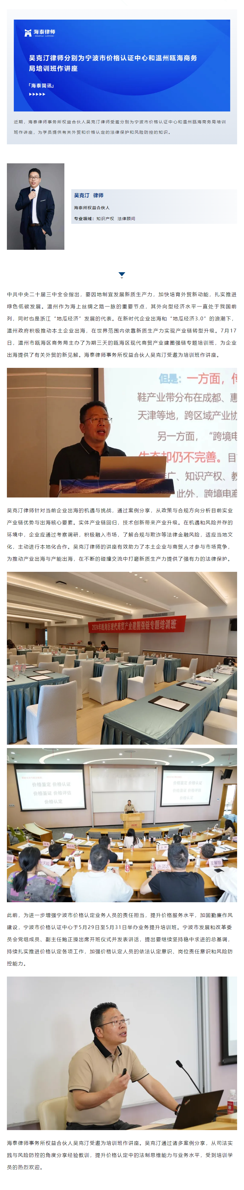 吴克汀律师分别为宁波市价格认证中心和温州瓯海商务局培训班作讲座 | 海泰简讯