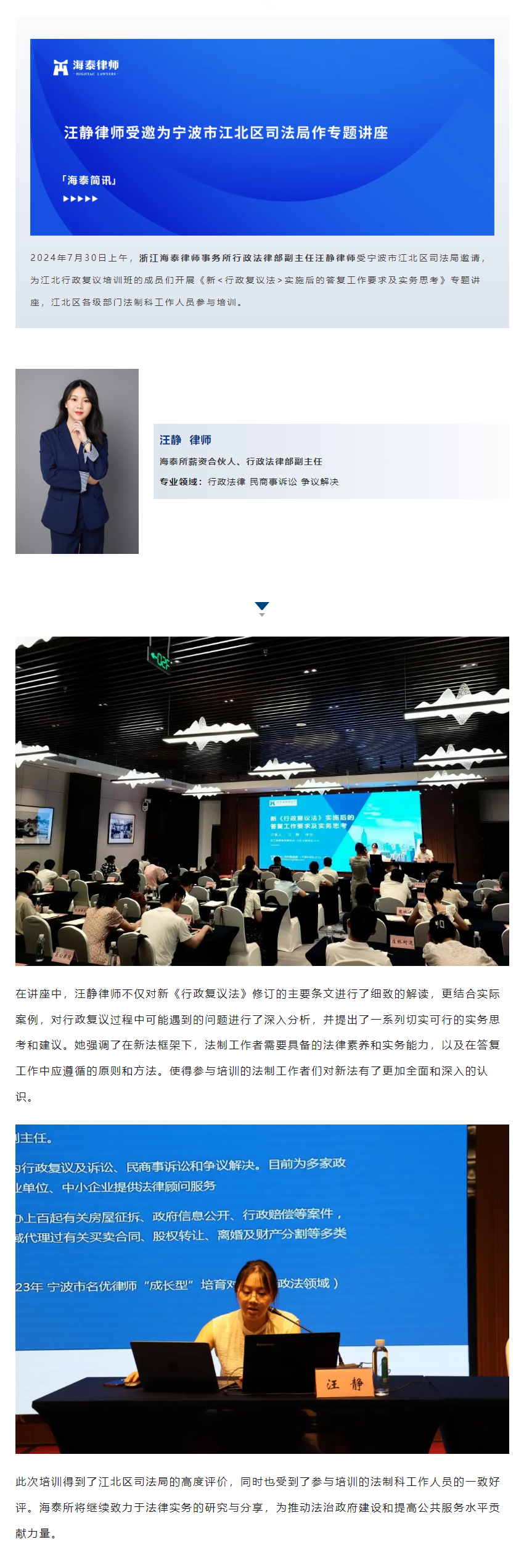 汪静律师受邀为宁波市江北区司法局作专题讲座 | 海泰简讯