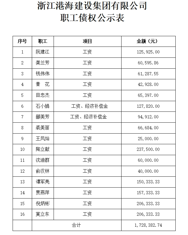 经管理人调查,截至破产受理日,浙江港海建设集团有限公司尚欠职工的工资、经济补偿金等费用(以上统称职工债权)总金额为人民币【1,728,382.74】元(详见职工债权公示表)。现根据《中华人民共和国企业破产法》第四十八条的规定,予以公示。公示日期截止2024年12月14日。
