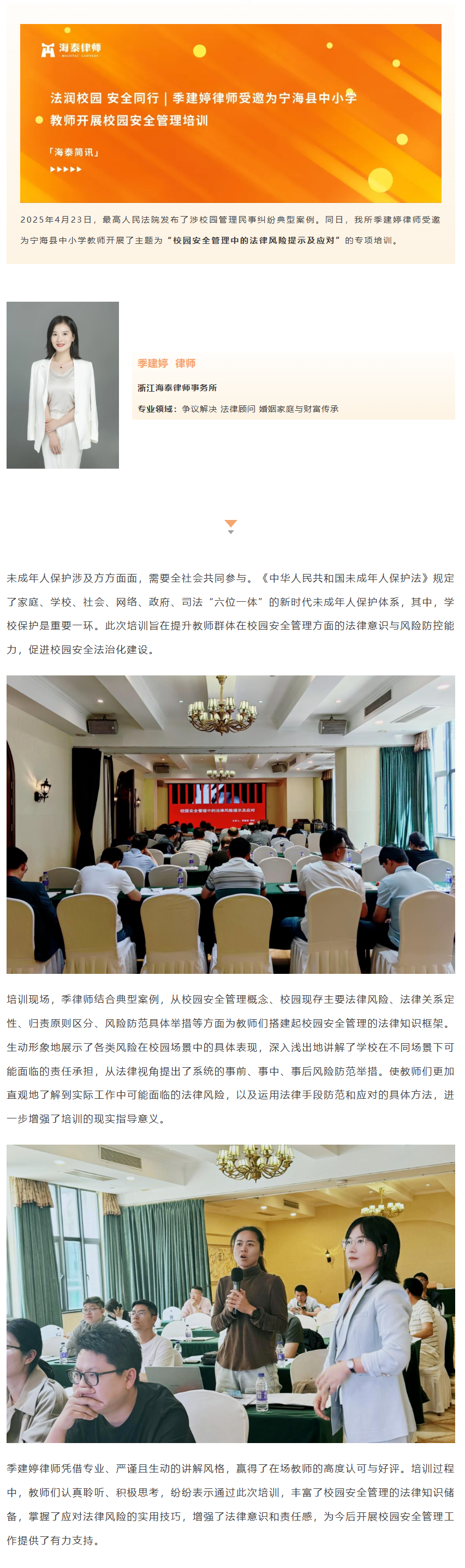 法润校园 安全同行 | 季建婷律师受邀为宁海县中小学教师开展校园安全管理培训
