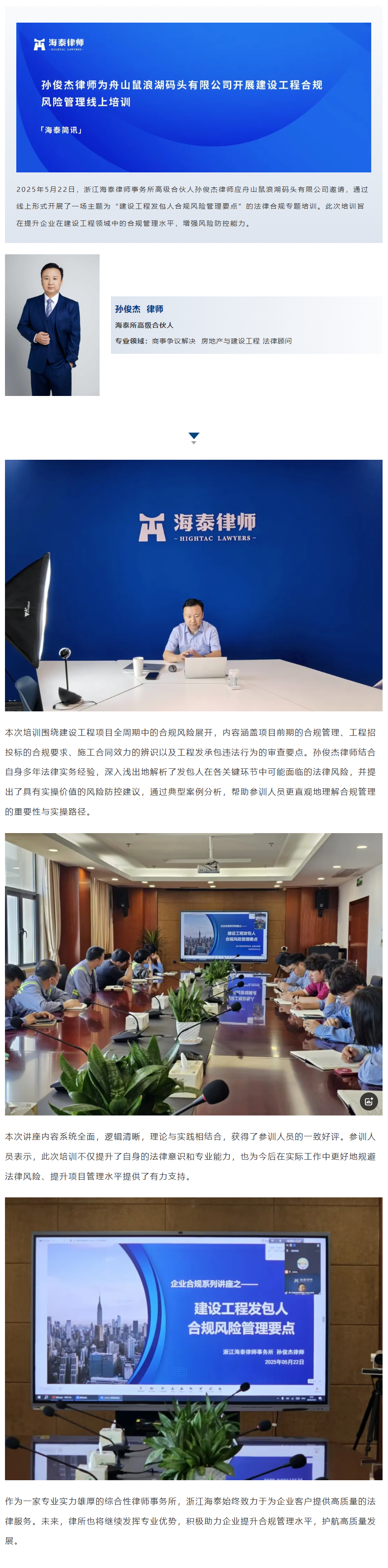 孙俊杰律师为舟山鼠浪湖码头有限公司开展建设工程合规风险管理线上培训