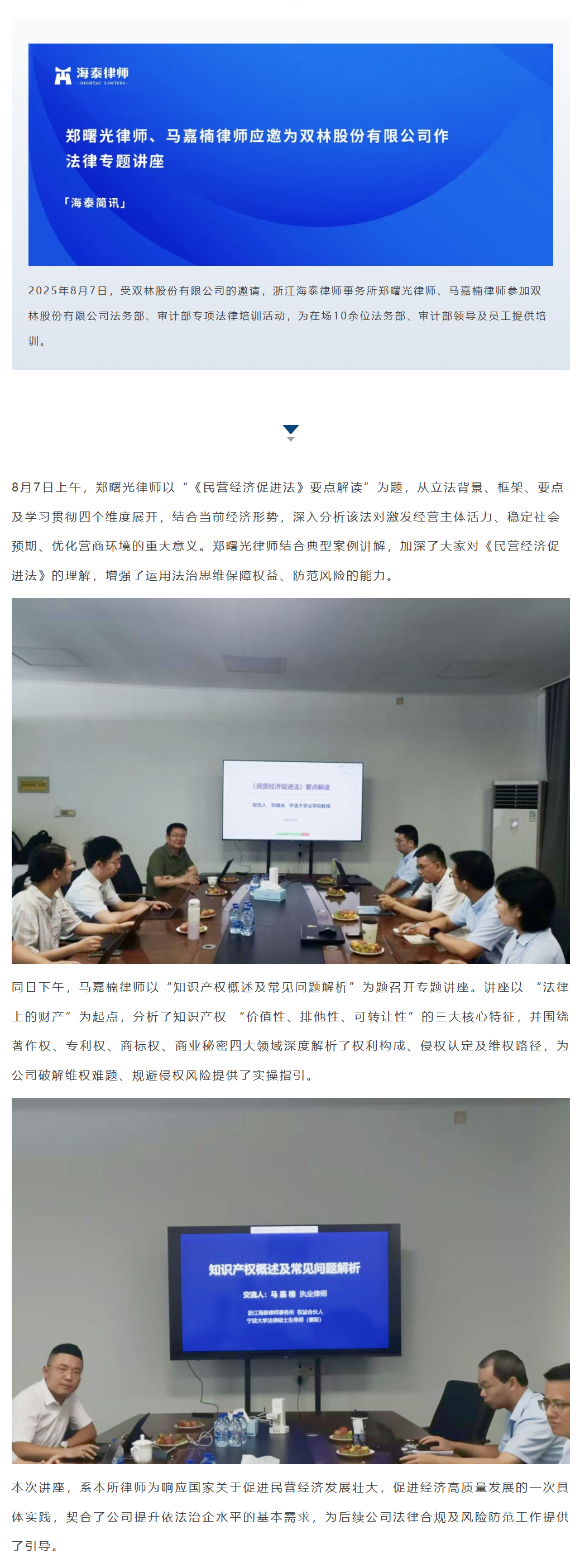 郑曙光律师、马嘉楠律师应邀为双林股份有限公司作法律专题讲座 | 海泰简讯